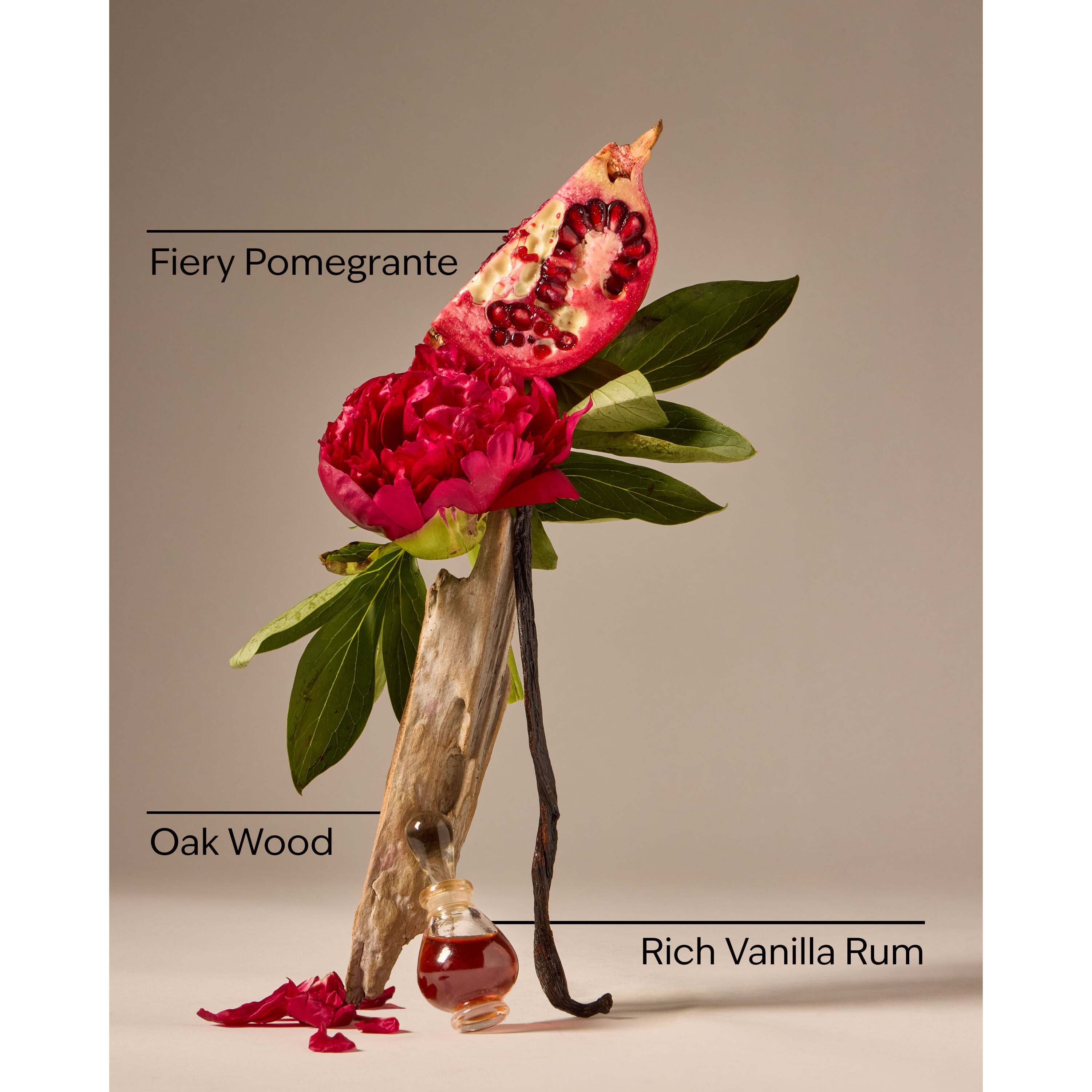 Fragrance Notes: Fiery Pomegranate, Red Peony, Rich Vanilla Rum And Oak Wood.